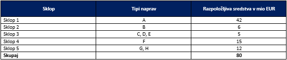 Skupna višina razpisanih sredstev znaša 80 milijonov EUR. Razpoložljiva sredstva so po posameznih sklopih razdeljena na način prikazan spodaj.