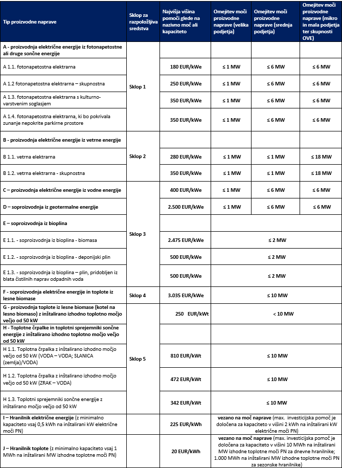 - Podrobnejše tehnične zahteve glede proizvodnih naprav in z njimi povezanega shranjevanja električne ali toplotne energije ter druge podrobnosti glede dodeljevanja pomoči ter izpolnjevanja pogojev, so opredeljene v javnem pozivu.